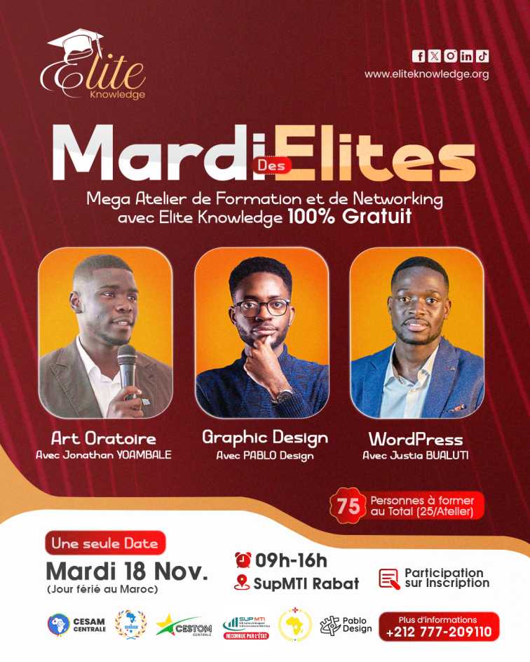 CEO d’Elite Knowledge, Justia BUALUTI s’engage activement à accompagner les jeunes dans le développement de leurs compétences professionnelles et créatives. Son parcours l’a également conduit à travailler dans le domaine de la communication au sein de l’Union des Étudiants et Stagiaires Congolais au Maroc (U.E.S.CO.M.), où il a initié et dirigé plusieurs projets associatifs.